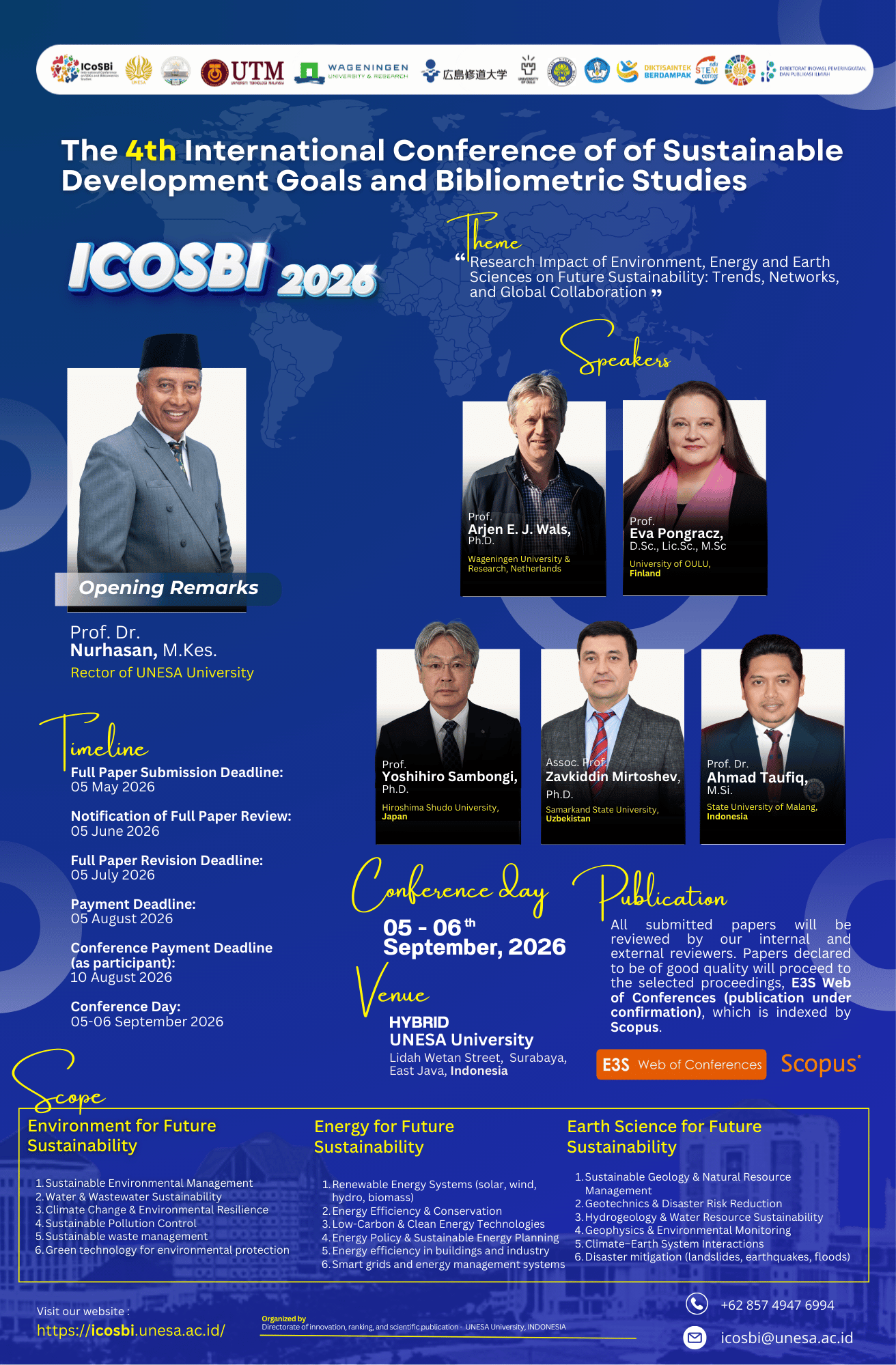 Under the theme “Research Impact of Environment, Energy, and Earth Sciences on Future Sustainability: Trends, Networks, and Global Collaboration,” ICoSBi 2026 brings together policymakers, researchers, academics, and practitioners to explore innovative, evidence-based solutions that support the United Nations 2030 Agenda for Sustainable Development.